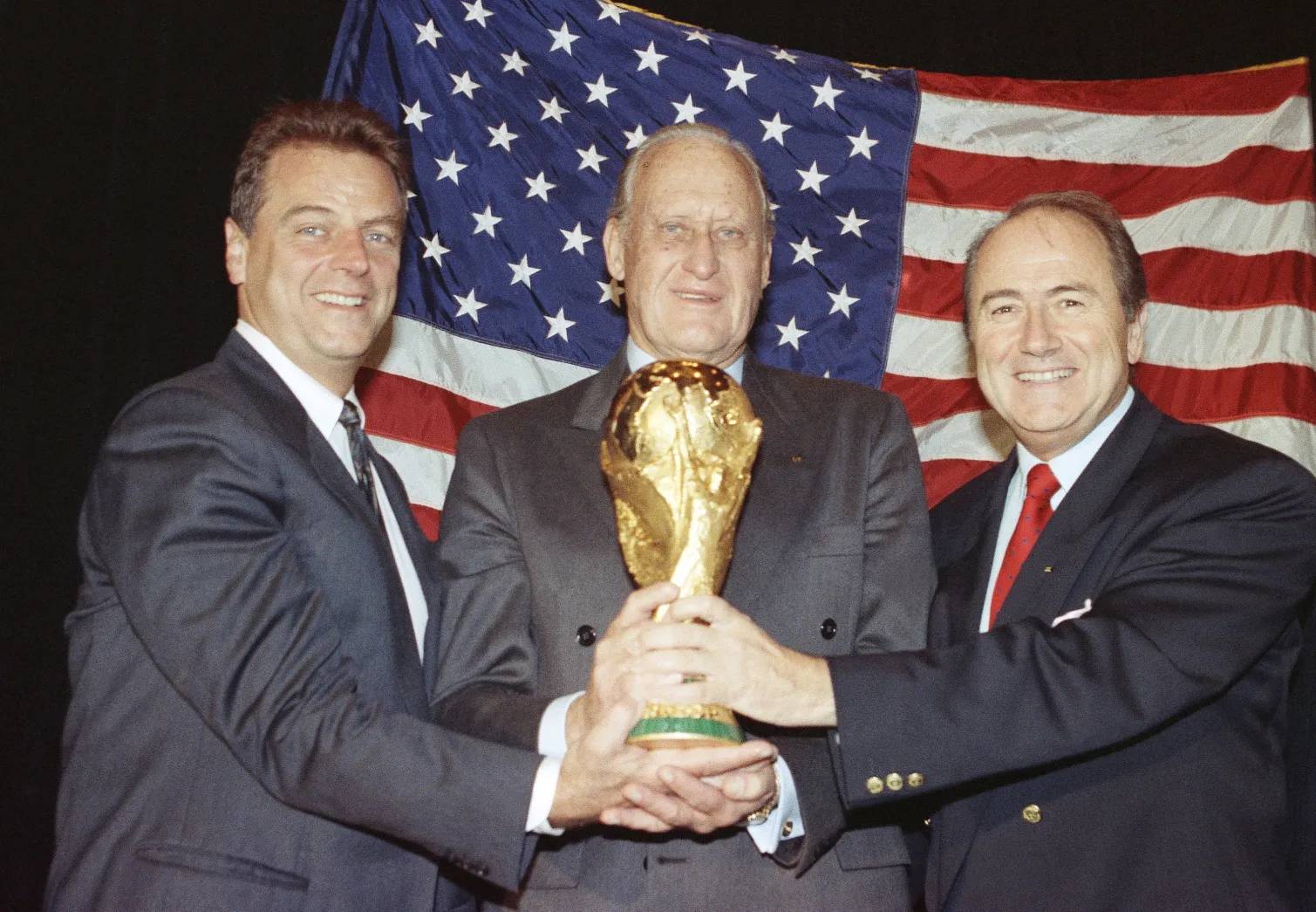Havelange, nhân vật quyền lực và cũng dính líu nhiều vụ “tiền chảy đầy túi” của FIFA, đứng giữa các quan chức bóng đá khác là Alan I Rothenberg ở Los Angeles, bên trái, và Joseph S. Blatter với Giải vô địch bóng đá thế giới FIFA 1994 tại New York.